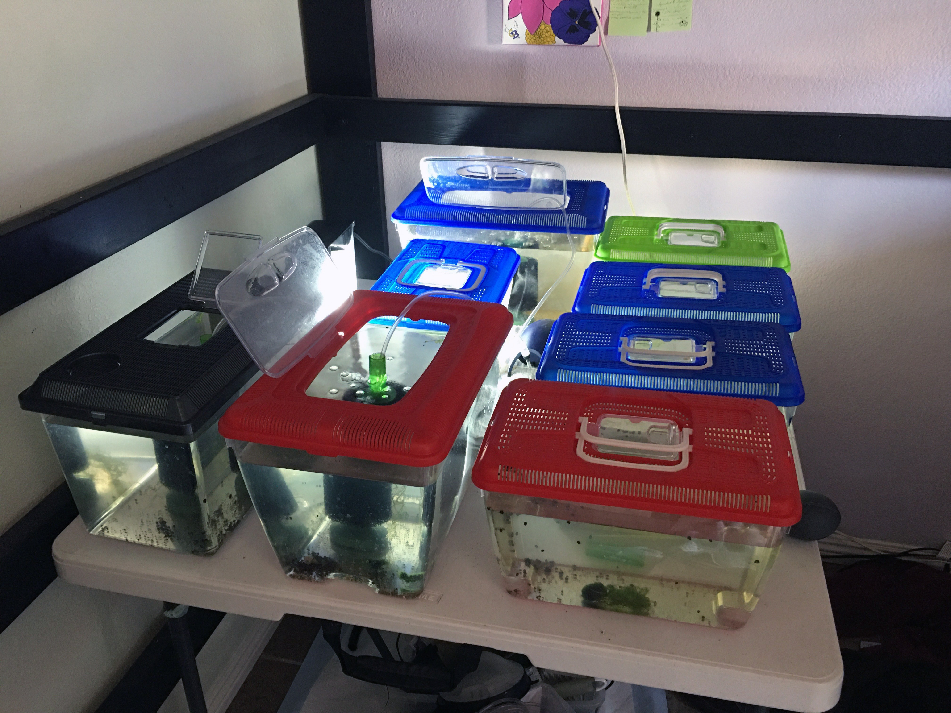I cultured Physa and a variety of other pulmonates in my lab for many years, and a couple prosobranch species as well [12], and was repeatedly surprised, perhaps even dismayed, by the requirement of simple space – just open, flat space on shelf and lab bench. There were times in my career that I was covering hundreds of square feet culturing snails with a maximum adult size of 30 mg. Adult mystery snails are two orders of magnitude larger than Physa. Am I going to go hat in hand and ask my wife for thousands of square feet in our suburban home to culture Pomacea?